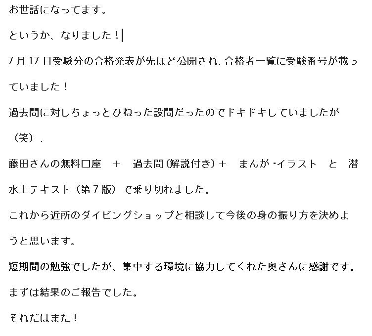 半年ごとに必ず公表される公表過去問題、私の解答と解説(有料)を参考にして、今後も潜水士試験を受験される皆様の力になれれば幸いだと思います。